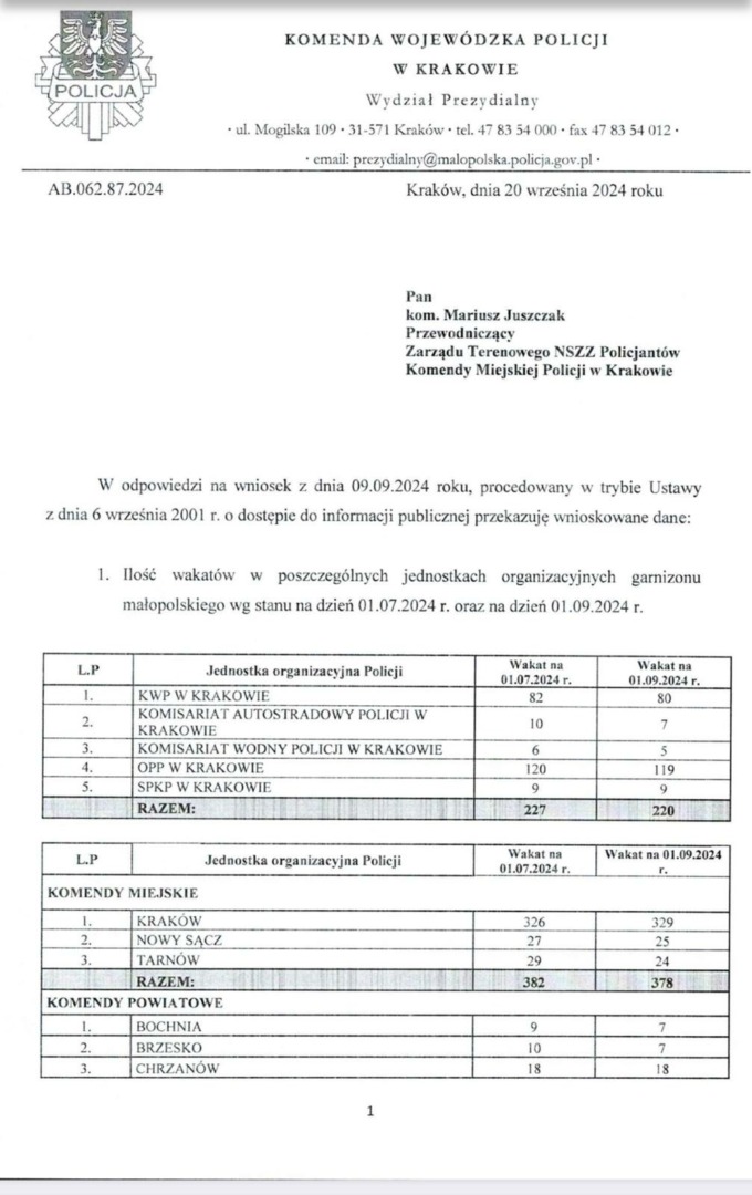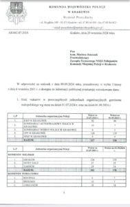 Braki kadrowe w Małopolskiej Policji – Przewodniczący ZT NSZZ Policjantów KMP w Krakowie interweniuje