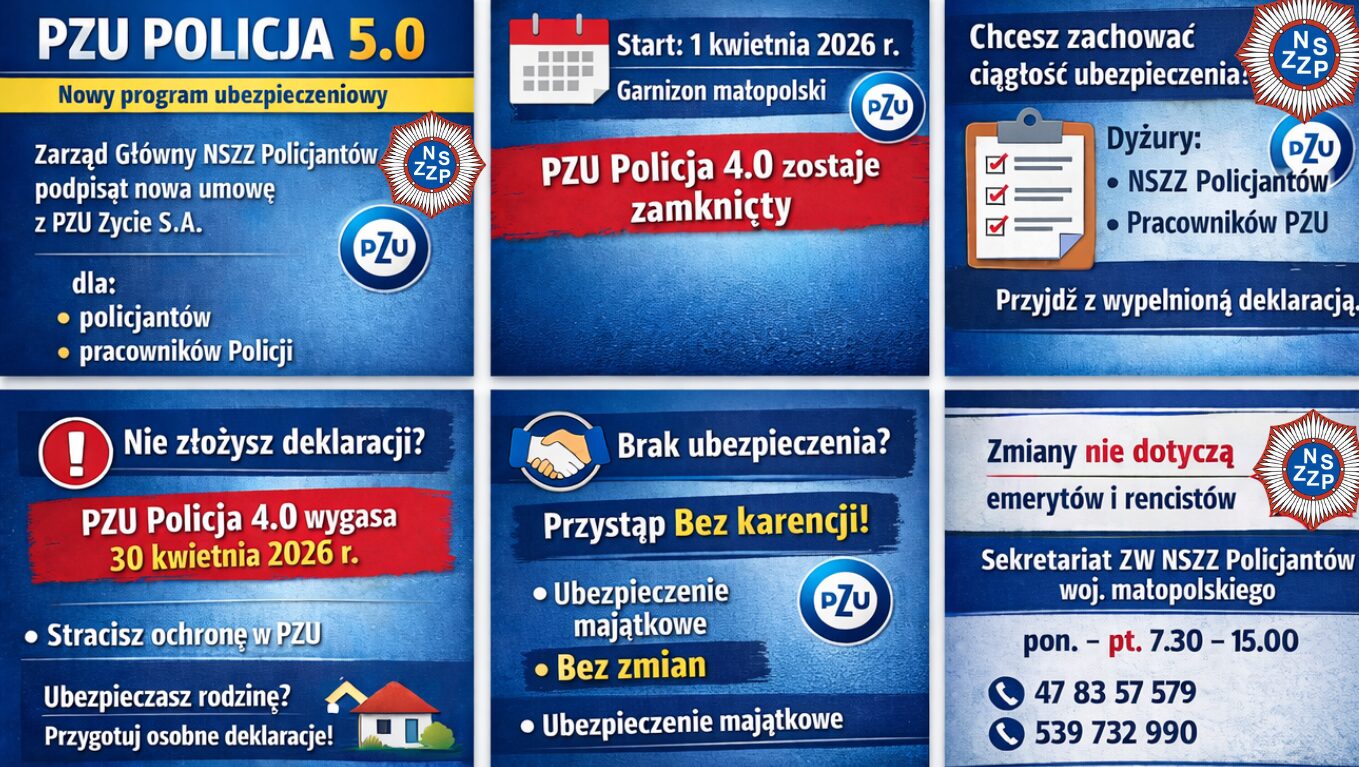 Zarząd Wojewódzki NSZZ Policjantów województwa małopolskiego informuje, że Zarząd Główny NSZZ Policjantów, we współpracy z innymi związkami zawodowymi działającymi w Policji, podpisał z PZU Życie S.A. nową umowę ubezpieczeniową pod nazwą PZU Policja 5.0. Program obejmuje funkcjonariuszy Policji oraz pracowników Policji w ramach grupowego ubezpieczenia.