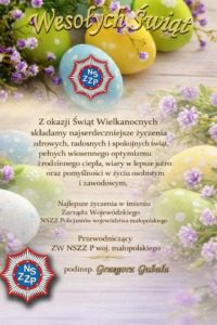 Z okazji Świąt Wielkanocnych Przewodniczący ZW NSZZ Policjantów woj. małopolskiego, podinsp. Grzegorz Gubała, w imieniu własnym oraz Prezydium Zarządu Wojewódzkiego składa najserdeczniejsze życzenia zdrowych, spokojnych i radosnych Świąt Wielkanocnych koleżankom i kolegom związkowcom, funkcjonariuszom i pracownikom Policji oraz emerytom i rencistom policyjnym.